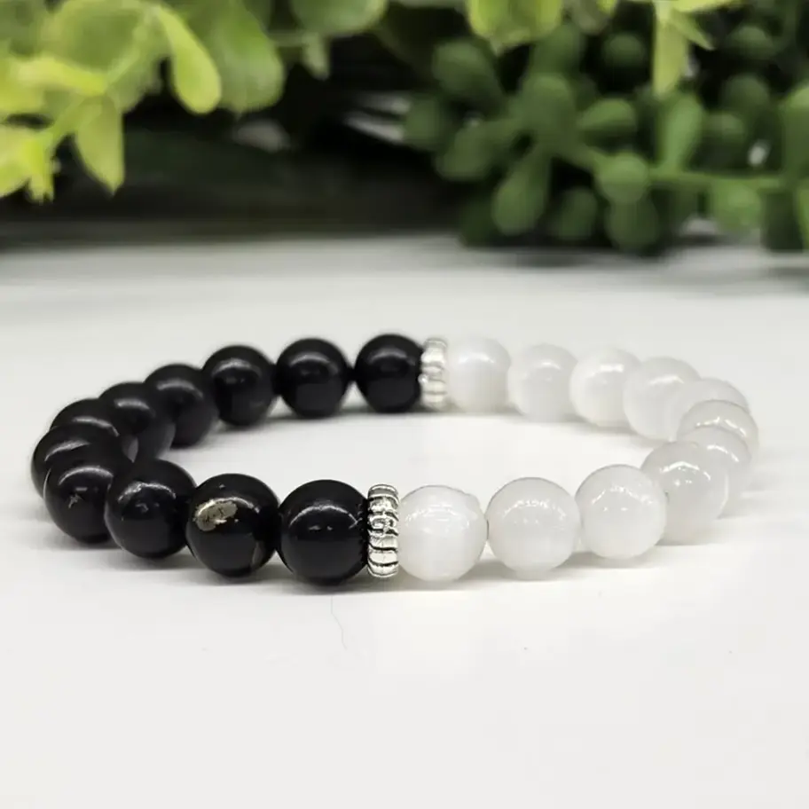 This bracelet is apart of our Intention bracelet set. This stretchable bracelet is made with Shungite and Selenite semi-precious 8mm gemstone beads. Shungite and Selenite help to bring forth the Intention of Protection. A great gift for that someone special that might need a little support. *Intention: Protection *Double strung for durability. *7.5 inches in length. *All natural semi-precious gemstones. This picture is an representation of the type and quality of the gemstone you will be receiving. As you know, there are slight variations due to the natural character of this product.